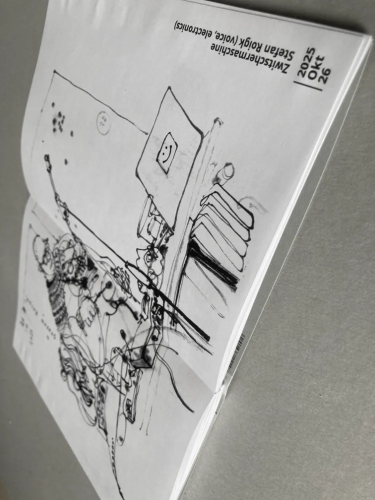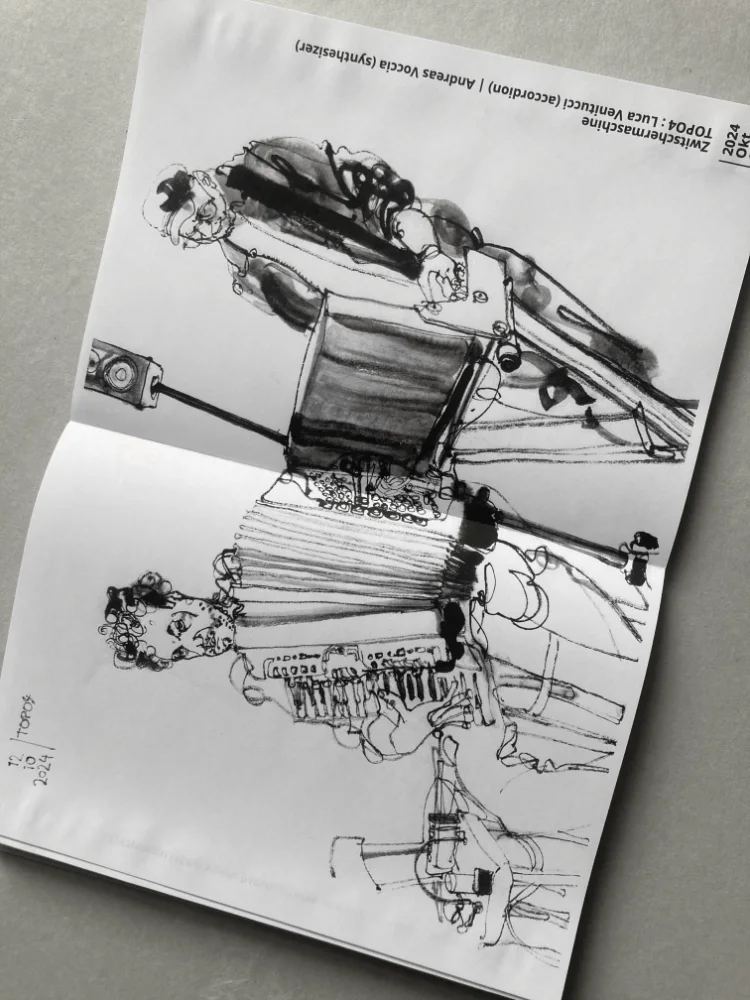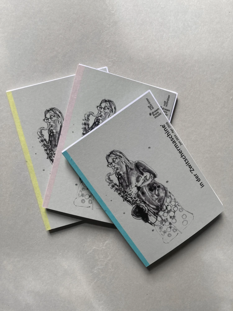 Zeichnungen von Konzerten, entstanden in der Zwitschermaschine, einem Ausstellungs- und Veranstaltungsort in Berlin Schöneberg, gesammelt in einem selbst gedruckten Buch.