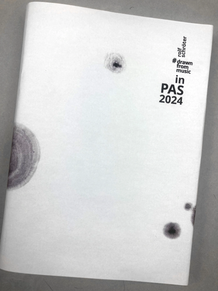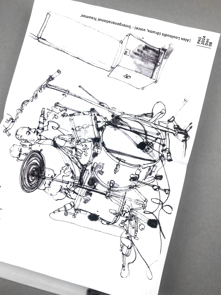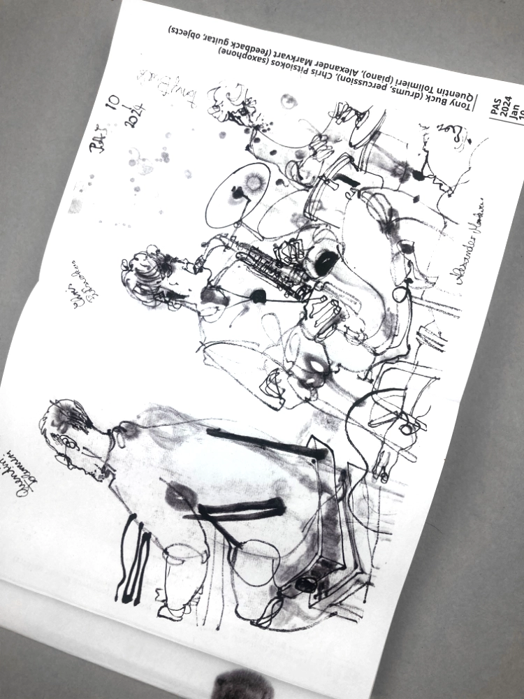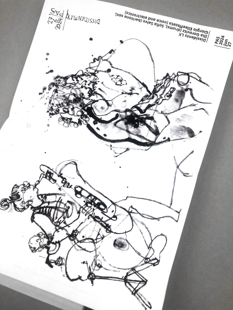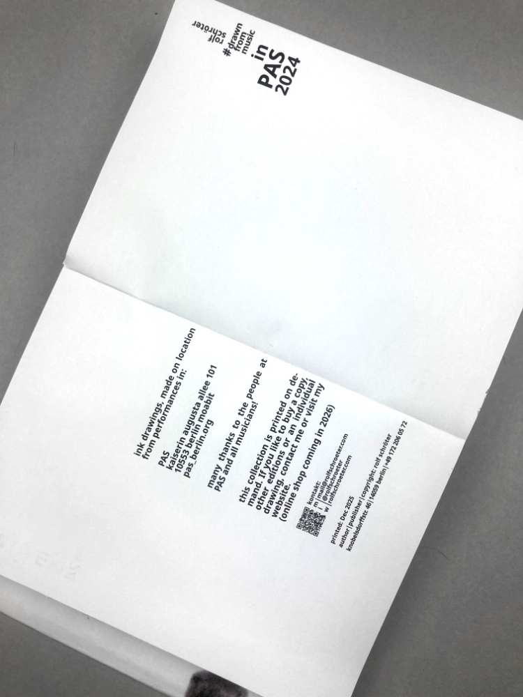 Drawings of concerts, made in PAS, a venue in Berlin Moabit, in the year 2024, collected in a home-printed book.