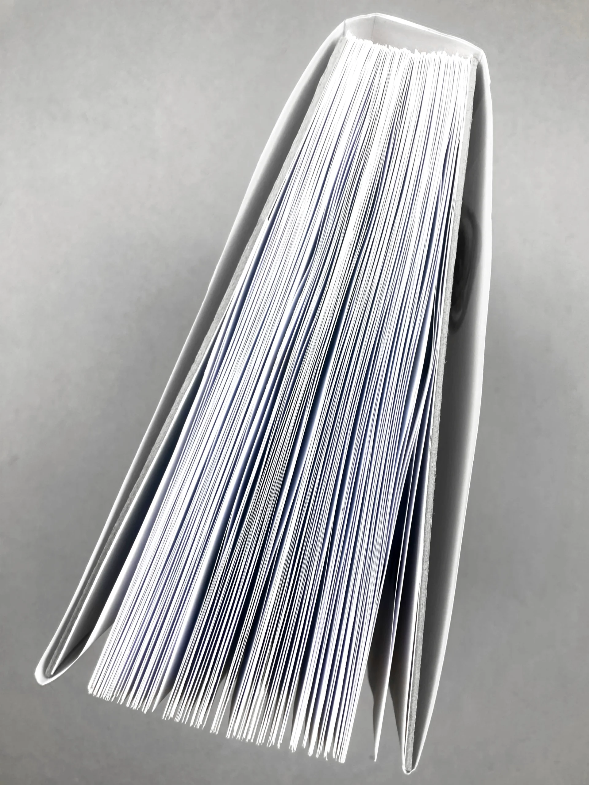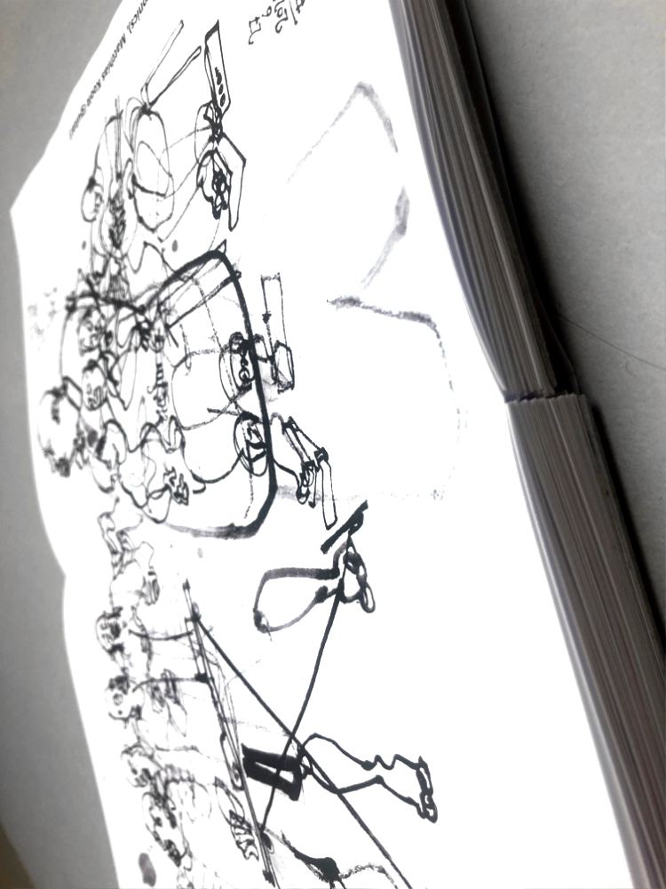 The scans, labelled with date and performing artists, are digitally printed on 60gr/m² paper, one sided with an ink jet printer and hand glued to hardcover books with an open spine. The books open flat and display the drawings as complete sheets in A4-size.