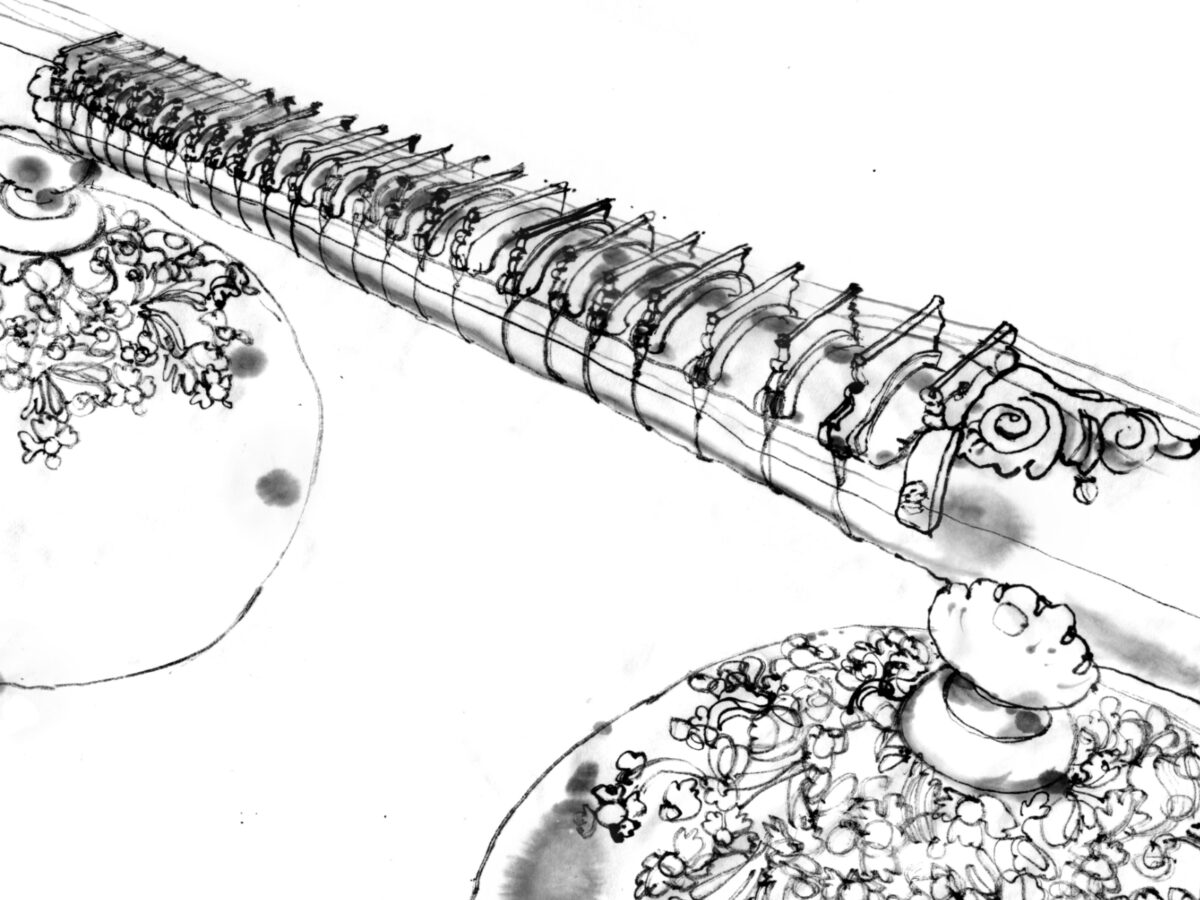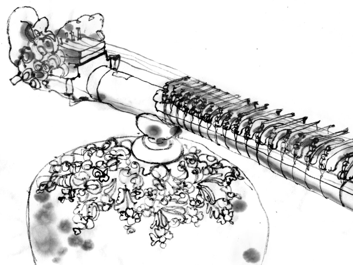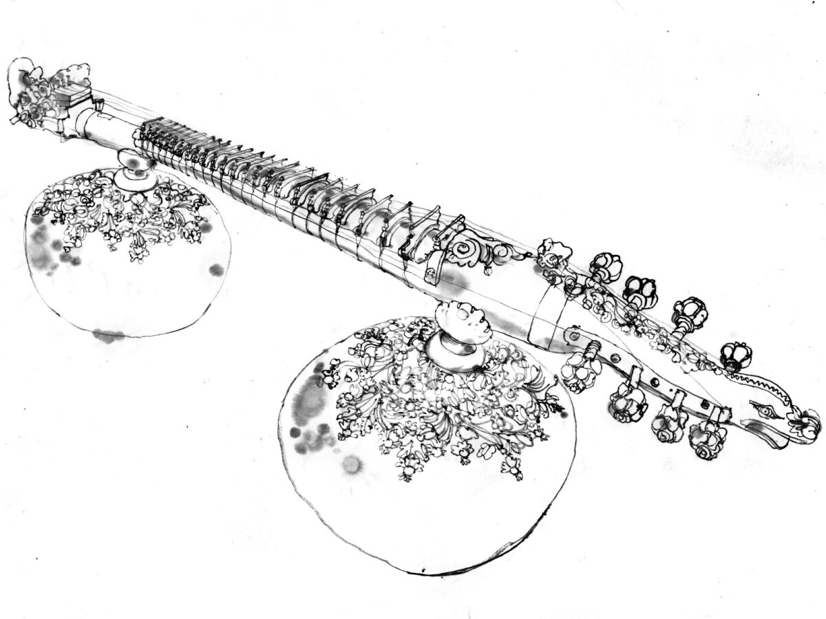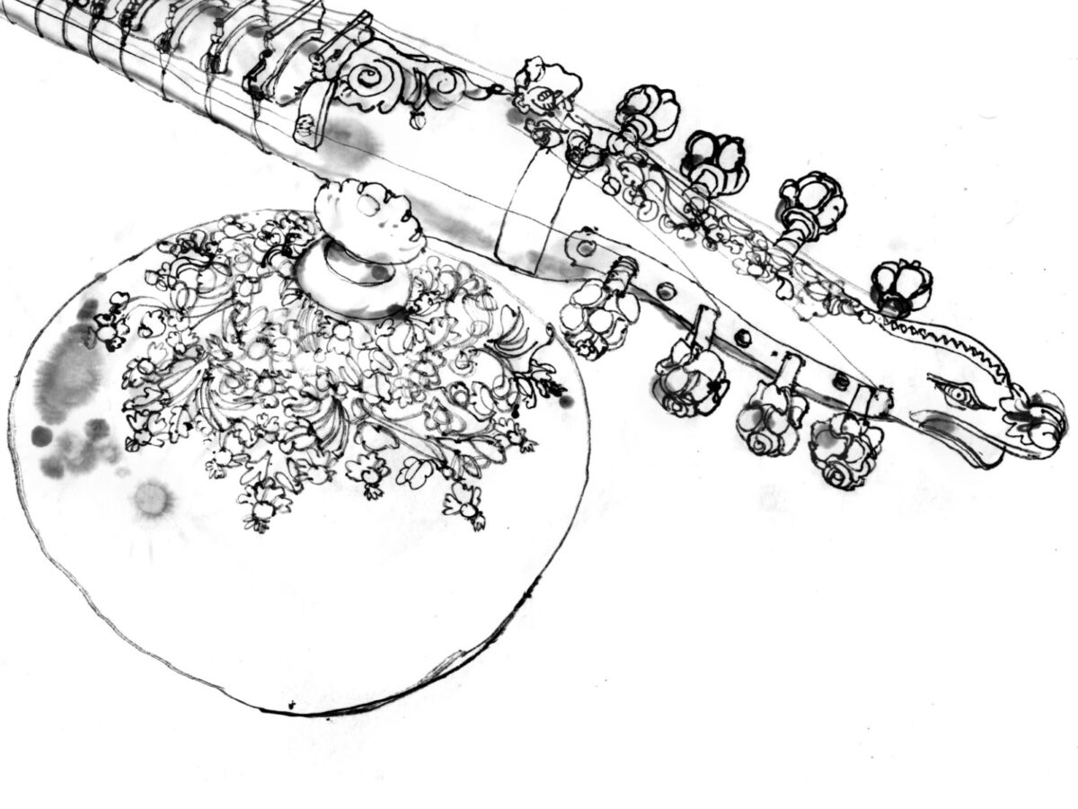 Leistungen: Tuschezeichnung einer Rudra Veena (nach der Beobachtung vor Ort)